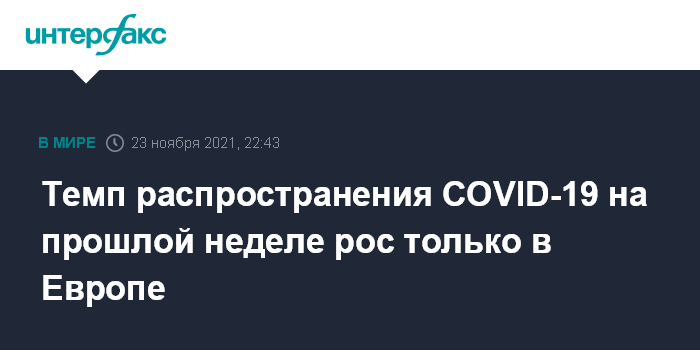 Согласно информации ВОЗ, за неделю с 15 по 21 ноября зафиксирован рост случаев заражения COVID-19 на 6% во всем мире. При этом Европа стала единственным регионом, в котором зафиксировали рост заболеваемости (на 11%). В остальных частях света заболеваемость упала или сохранилась на прежнем уровне. Наибольшее снижение выявили в Юго-Восточной Азии (на 11%) и в Восточном Средиземноморье (на 9%). Всего по всему миру за неделю было зафиксировано почти 3,6 млн новых случаев заболевания.