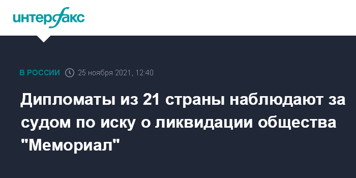 Москва. 25 ноября. INTERFAX.RU - Представители 21 страны наблюдают за судом по иску Генпрокуратуры о ликвидации общественной организации "Международное историко-просветительское, благотворительное и правозащитное общество "Мемориал" (признано в РФ НКО-иноагентом).