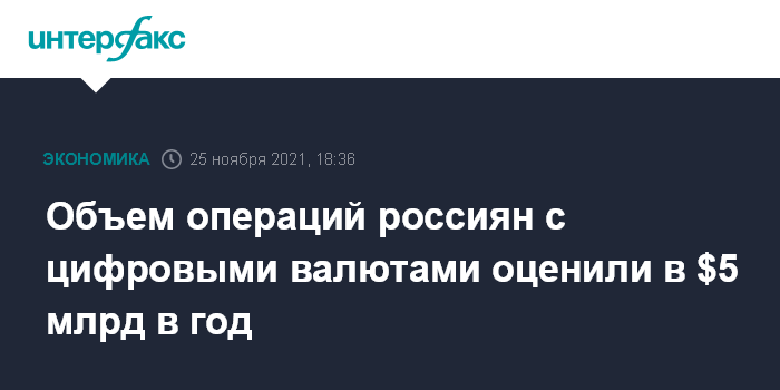 Москва. 25 ноября. INTERFAX.RU - Объем операций российских граждан с цифровыми валютами составляет порядка $5 млрд (около 350 млрд рублей) в год, говорится в "Обзоре финансовой стабильности", опубликованном на сайте ЦБ РФ.