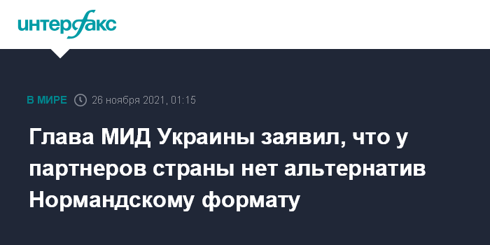Москва. 26 ноября. INTERFAX.RU - У партнеров Украины сейчас нет конкретных наработанных альтернатив Нормандскому формату, поэтому основной фокус делается на его оживлении, сообщил министр иностранных дел Украины Дмитрий Кулеба.