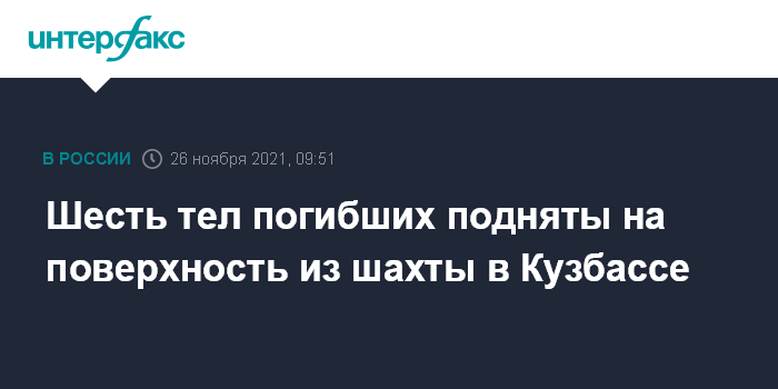Москва. 26 ноября. INTERFAX.RU - Спасатели подняли на поверхность тела шести погибших в шахте "Листвяжная", сообщается в телеграм-канале главы Кузбасса Сергея Цивилева.