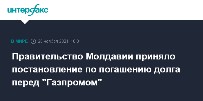 Москва. 26 ноября. INTERFAX.RU - Правительство Молдавии на специальном заседании в пятницу приняло постановление, направленное на погашение текущей задолженности перед "Газпромом", сообщила "Интерфаксу" пресс-служба молдавского кабмина.