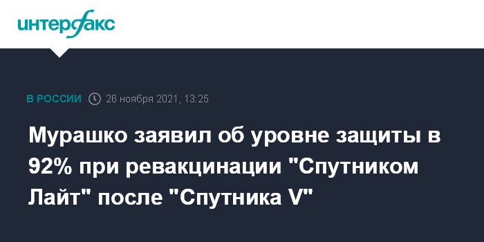 Москва. 26 ноября. INTERFAX.RU - Повторная вакцинация "Спутником Лайт" после прививки "Спутником V" создает лучшую защиту против коронавируса на уровне более 92%, заявил в пятницу глава Минздрава РФ Михаил Мурашко.