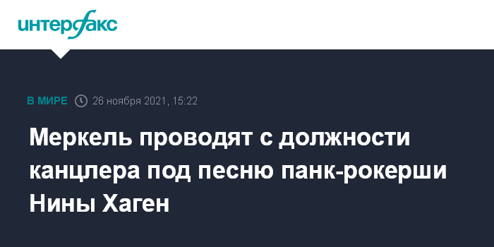 Москва. 26 ноября. INTERFAX.RU - Для церемонии прощания с должностью канцлера Ангела Меркель выбрала песни звезды пятидесятых годов прошлого века Хильдегард Кнеф и культовой панк-рокерши Нины Хаген, родившейся в ГДР, сообщает в пятницу журнал Der Spiegel со ссылкой на собственные источники.