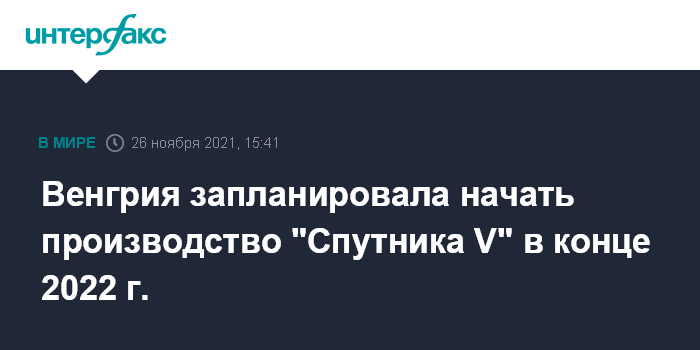 Москва. 26 ноября. INTERFAX.RU - Венгрия планирует начать производство российской вакцины против коронавируса "Спутник V" в конце 2022 года. Об этом заявил в пятницу министр внешнеторговых связей и иностранных дел Венгрии Петер Сийярто.
