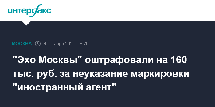 Москва. 26 ноября. INTERFAX.RU - Пресненский суд Москвы назначил штраф в размере 160 тыс. рублей "Эхо Москвы" за публикацию на сайте радиостанции сведений о признанных иностранным агентом организациях без соответствующей маркировки.