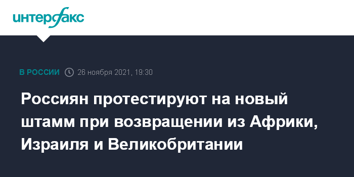 Москва. 26 ноября. INTERFAX.RU - Оперштаб поручил Роспотребнадзору организовать экспресс-тестирование на новую коронавирусную инфекцию граждан России, возвращающихся из ряда африканских государств, включая ЮАР, где был обнаружен новый штамм SARS-CoV-2 B.1.1.529. В число стран вошли также Гонконг, Великобритания, КНР и Израиль.
