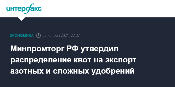 Москва. 24 ноября. INTERFAX.RU - Минпромторг РФ утвердил приказ о распределении квот на экспорт азотных и сложных удобрений с 1 декабря 2021 по 31 мая 2022 года.