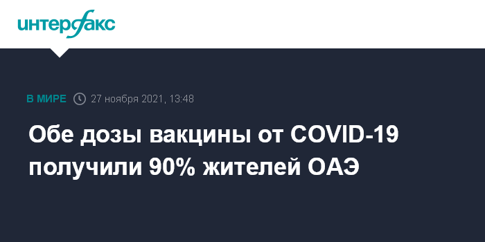 Москва. 27 ноября. INTERFAX.RU - Все жители ОАЭ, не имеющие медицинских противопоказаний, получили минимум одну дозу вакцины от COVID-19, сообщают в субботу западные СМИ со ссылкой на Минздрав страны.