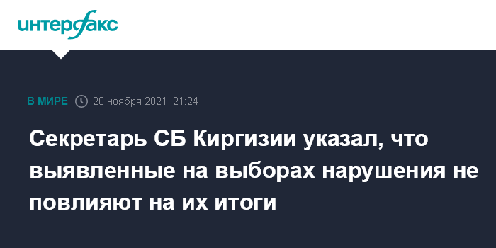 Москва. 28 ноября. INTERFAX.RU - Выявленные нарушения в ходе выборов депутатов парламента Киргизии не повлияют на итоги голосования, заявил секретарь Совета безопасности страны Марат Иманкулов на брифинге в воскресенье.