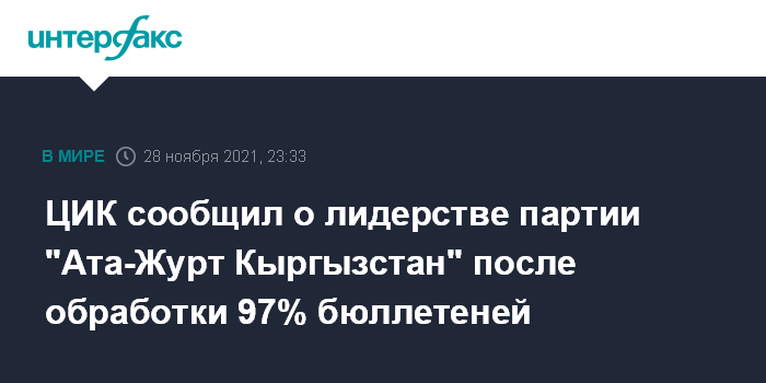 Москва. 28 ноября. INTERFAX.RU - ЦИК Киргизии обработала более 97% бюллетеней на выборах в парламент страны, согласно электронному подсчету голосов количество политических партий, проходящих в законодательный орган сократилось до пяти.