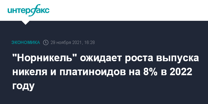 Москва. 29 ноября. INTERFAX.RU - "Норникель" ожидает роста выпуска никеля в 2022 году на 8%, до 205-215 тысяч тонн, следует из презентации компании ко Дню стратегии.