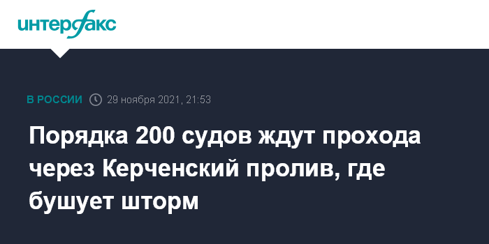 Москва. 29 ноября. INTERFAX.RU - Несколько сотен судов ожидают улучшения погоды, чтобы пройти Керченский пролив, где сейчас бушует шторм.