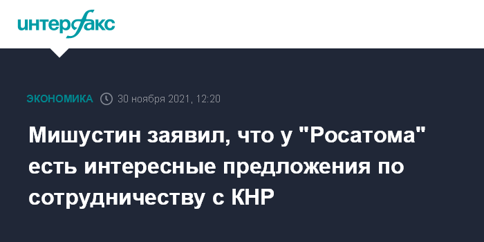 Москва. 30 ноября. INTERFAX.RU - "Росатом" намерен развивать взаимодействие с китайскими партнерами, заявил премьер-министр РФ Михаил Мишустин.