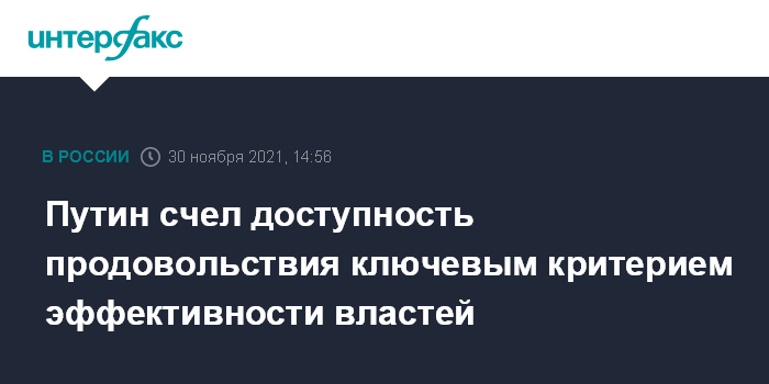 Москва. 30 ноября. INTERFAX.RU - Увеличение объемов производства и повышение доступности продовольствия будет ключевым критерием эффективности работы правительства и региональных властей в сфере борьбы с ростом потребительских цен, заявил президент РФ Владимир Путин.