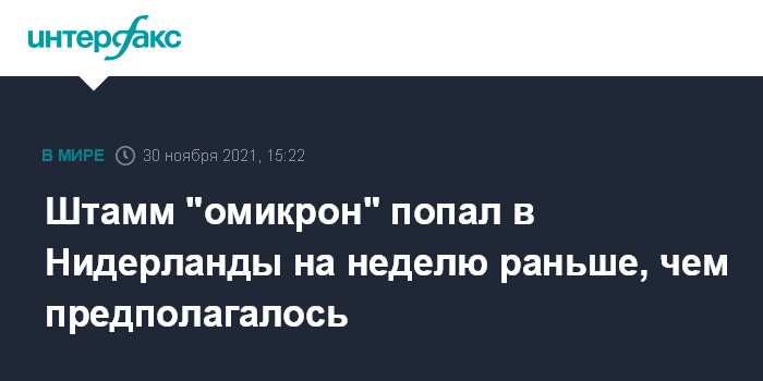 "В RIVM обнаружили штамм "омикрон" в двух тестах, которые были сделаны в Нидерландах ранее в ноябре", - говорится в заявлении на сайте RIVM. "Омикрон" выл выявлен в образцах, взятых 19 и 23 ноября.