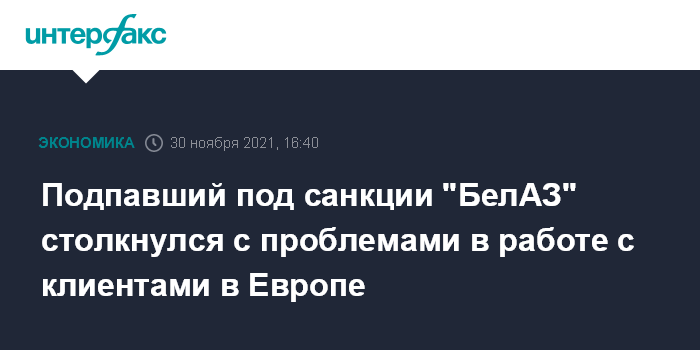 21 июня 2021 года вступили в силу санкции ЕС против 78 белорусских физических лиц и восьми организаций из-за ситуации с нарушением прав человека в Белоруссии. В частности, санкции распространяются на Минский автозавод ("МАЗ"), "БелАЗ" и "Белаэронавигацию".