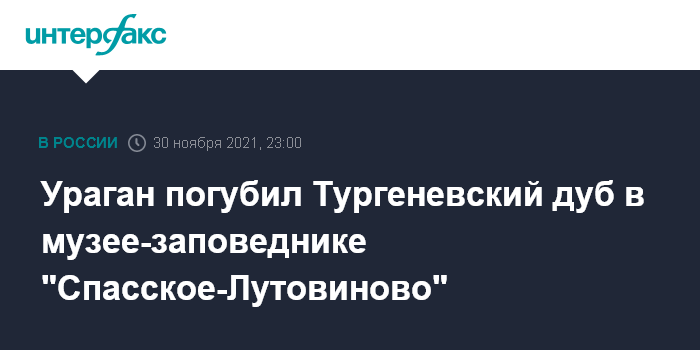 "30 ноября 2021 года разгул стихии нанес непоправимый ущерб усадебному парку. Только в партерной части музея-заповедника под порывами ураганного ветра, достигавшего 30 м/с, погибли несколько старых елей, ясеней и берез, немало потерь в старинной липовой аллее. Но настоящей трагедией стало падение Тургеневского дуба", - говорится в сообщении.