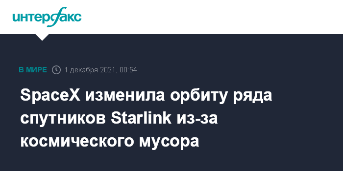 Москва. 1 декабря. INTERFAX.RU - Американская аэрокосмическая компания SpaceX изменила орбиту нескольких интернет-спутников Starlink, чтобы избежать их столкновения с космическим мусором, сообщил основатель компании Илон Маск.