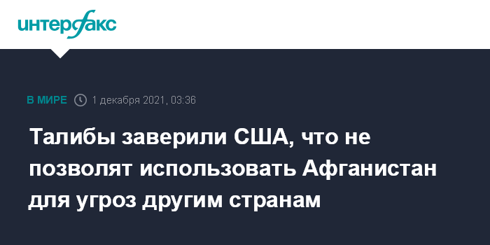 Москва. 1 декабря. INTERFAX.RU - Представители афганского террористического движения "Талибан" (запрещено в РФ) на состоявшейся в Катаре встрече с делегацией американских чиновников подтвердили, что территория Афганистана не будет использоваться для нападения или угроз третьим странам, сообщил Госдепартамент США.