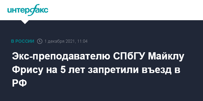 Москва. 1 декабря. INTERFAX.RU - Власти РФ запретили въезд в страну гражданину США Майклу Фрису, работавшему на факультете свободных искусств и наук Санкт-Петербургского государственного университета.