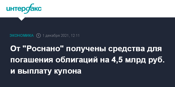 От "Роснано" получены средства для погашения облигаций на 4,5 млрд руб. и выплату купона