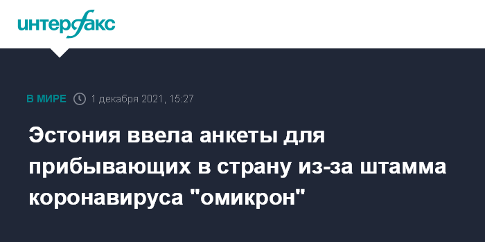Москва. 1 декабря. INTERFAX.RU - В Эстонии 1 декабря ввели анкету, которую прибывающие в страну должны заполнять при пересечении границы, в связи с риском распространения нового штамма коронавируса "омикрон".