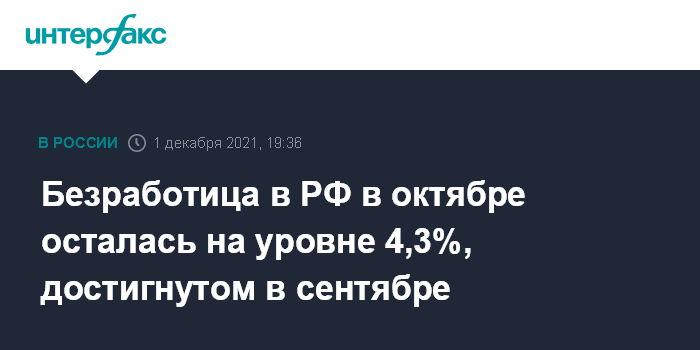 Как сообщалось, в январе этого года безработица в РФ составляла 5,8%, в феврале - 5,7%, в марте - 5,4%, в апреле - 5,2%, в мае - 4,9%, в июне - 4,8%, в июле - 4,5% (на 0,2 п.п. ниже допандемийного уровня), в августе - 4,4%, в сентябре - 4,3%.