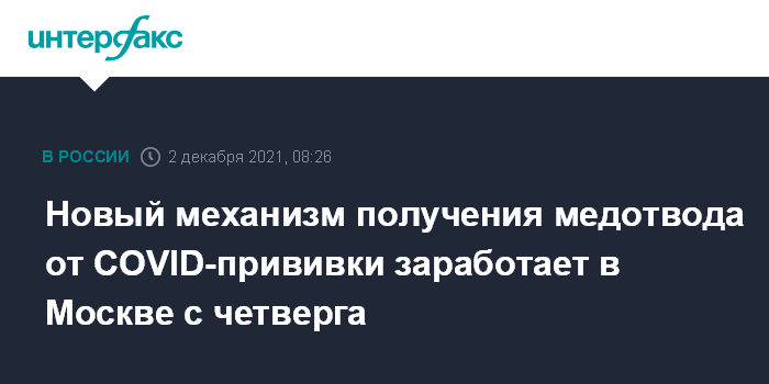 Москва. 2 декабря. INTERFAX.RU - Новый механизм получения медицинского отвода от прививки против COVID-19 разработан московским правительством, справку по новому алгоритму можно будет получить со 2 декабря, сообщили в пресс-службе столичного департамента здравоохранения.