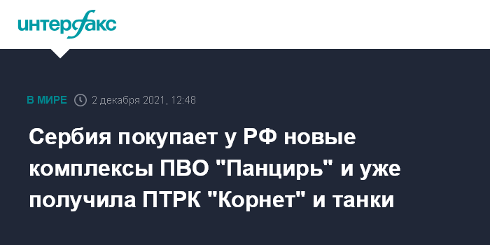 25 ноября СМИ со ссылкой на президента Сербии Вучича сообщили, что пусковые установки и бронебойные ракеты комплексов "Корнет" будут поставлены в Сербию до конца 2021 года.
