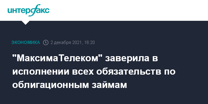 Москва. 2 декабря. INTERFAX.RU - АО "МаксимаТелеком" заявила об исполнении все обязательств по облигационным займам, ближайшая выплата по купону по одному из выпусков планируется 18 января 2022 года.