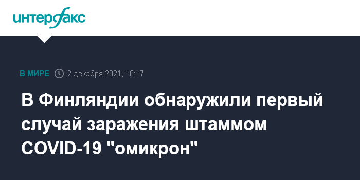 Москва. 2 декабря. INTERFAX.RU - В Финляндии выявили первый случай заражения новым штаммом коронавируса COVID-19 "омикрон", сообщается в четверг на сайте Института здравоохранения Финляндии.