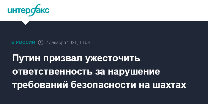 Москва. 2 декабря. INTERFAX.RU - Президент РФ Владимир Путин выступил за ужесточение требований к обеспечению безопасности на шахтах и детализацию составов административных правонарушений в этой сфере.