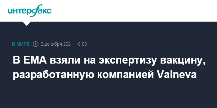 Москва. 2 декабря. INTERFAX.RU - Комитет EMA по лекарствам (CHMP) принял на экспертизу вакцину VLA2001, разработанную французской биотехнологической компанией Valneva, сообщили в пресс-службе ведомства.