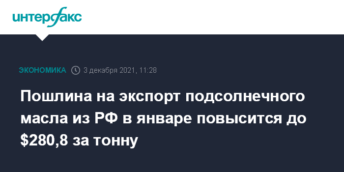 Москва. 3 декабря. INTERFAX.RU - Пошлина на экспорт подсолнечного масла из РФ в январе 2022 года повысится до $280,8 за тонну с $276,7 в декабре, сообщил Минсельхоз.