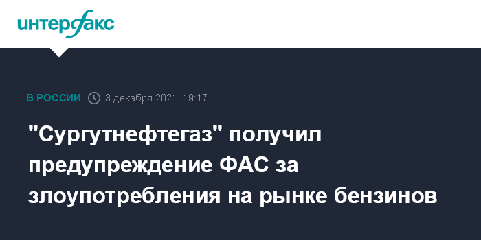 Москва. 3 декабря. INTERFAX.RU - Федеральная антимонопольная служба сообщила, что выдала предупреждение "Сургутнефтегазу" за злоупотребление доминирующим положением на рынке бензинов.