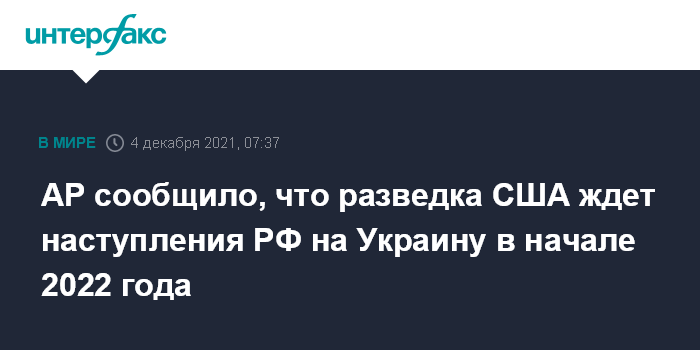 Москва. 4 декабря. INTERFAX.RU - Данные американских разведслужб свидетельствуют о том, что якобы планируемое вторжение России на Украину может быть осуществлено в начале 2022 года, сообщает Associated Press со ссылкой на анонимного сотрудника администрации США.