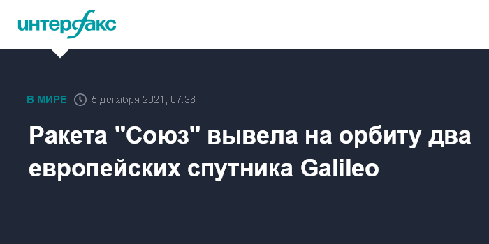 Москва. 5 декабря. INTERFAX.RU - Российская ракета-носитель "Союз-СТ-Б", стартовавшая в воскресенье с космодрома Куру во Французской Гвиане, успешно вывела на орбиту два спутника европейской глобальной навигационной системы Galileo, сообщила компания-оператор запуска Arianespace.