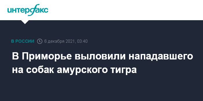 Москва. 6 декабря. INTERFAX.RU - Амурского тигра, убившего семь собак в Пожарском районе Приморья, выловили, чтобы перевезти подальше от людских поселений, сообщает в понедельник пресс-служба Центра "Амурский тигр".