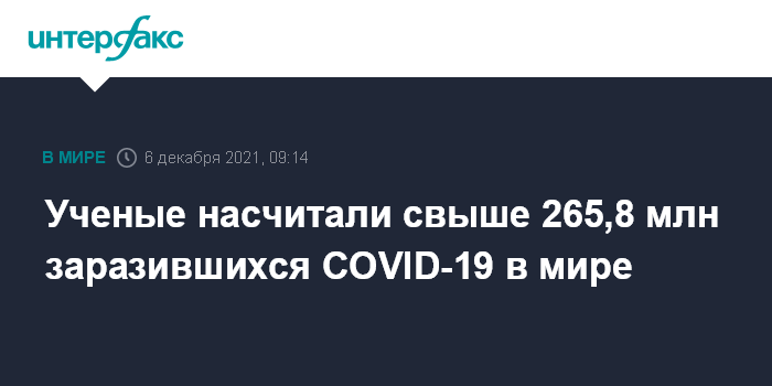 Москва. 6 декабря. INTERFAX.RU - Число зарегистрированных случаев заражения коронавирусом COVID-19 в мире на утро понедельника выросло до 265 854 752, свидетельствуют данные американского университета Джонса Хопкинса.