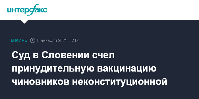 Москва. 6 декабря. INTERFAX.RU - Конституционный суд Словении постановил, что указ о принудительной вакцинации государственных работников от коронавируса является незаконным, сообщают в понедельник европейские СМИ.