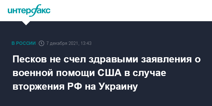 Москва. 7 декабря. INTERFAX.RU - Пресс-секретарь президента РФ Дмитрий Песков называл лишенными здравого смысла прозвучавшие из Вашингтона заявления о том, что США в случае "вторжения" РФ на Украину окажет военную помощь союзникам на восточном фланге НАТО.