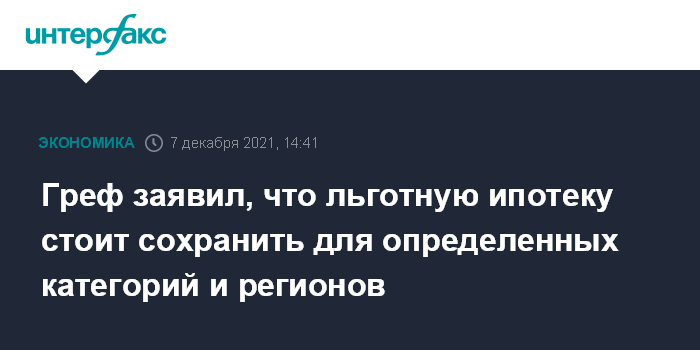 Москва. 7 декабря. INTERFAX.RU - Программу льготной ипотеки с господдержкой можно было бы сохранить после планируемого срока ее завершения 1 июля 2022 года для определенных категорий заемщиков и отдельных регионов, предложил глава Сбербанка Герман Греф.