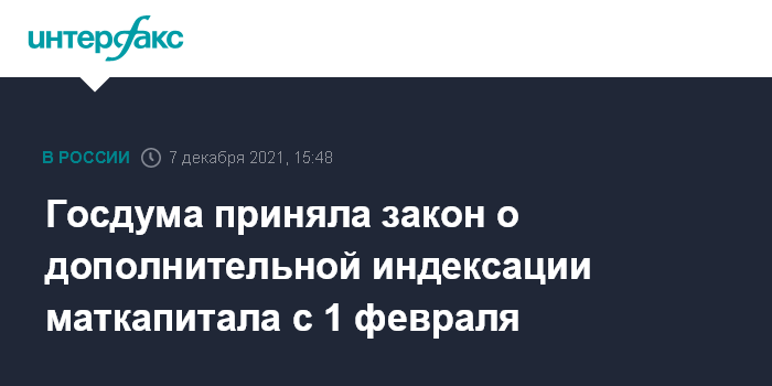 Ранее о необходимости пересчета размера материнского капитала и социальных пособий заявлял президент РФ Владимир Путин. "Сейчас в соответствии с законом только материнский капитал индексируется по прогнозной инфляции. Предлагаю уже с 2022 года также перейти на индексацию материнского капитала не по прогнозной, а по фактической инфляции за предыдущий год. Попрошу депутатов принять необходимые изменения в закон", - сказал он в ходе встречи с депутатами в октябре.