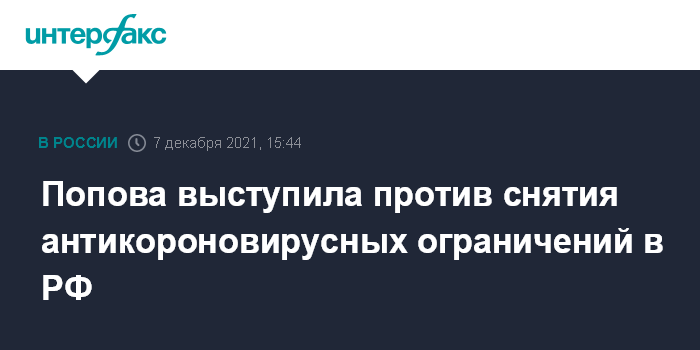 Москва. 7 декабря. INTERFAX.RU - Никакие введенные в РФ антикоронавирусные ограничения снимать нельзя, это может привести к росту заболеваемости COVID-19, заявила во вторник глава Роспотребнадзора Анна Попова.