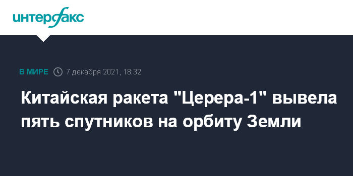 Москва. 7 декабря. INTERFAX.RU - Ракета-носитель "Церера-1" частной китайской аэрокосмической компании Galactic Energy успешно вывела пять спутников для научных и разведывательных целей на солнечно-синхронную орбиту Земли, сообщила во вторник Китайская глобальная телевизионная сеть (CGTN).
