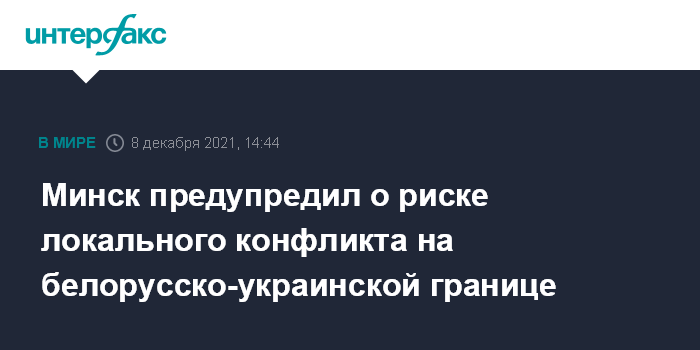 Москва. 8 декабря. INTERFAX.RU - Госсекретарь Совета безопасности Белоруссии Александр Вольфович предупредил об опасности возникновения локального конфликта на белорусско-украинской границе из-за действий украинских военных, разворачивающих там группировку вооруженных сил.