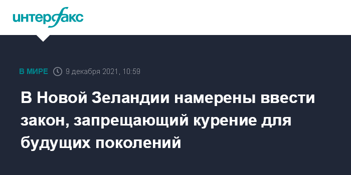 Москва. 9 декабря. INTERFAX.RU - Власти Новой Зеландии объявили в четверг о планах запретить курение, сделав незаконной продажу и поставку табачной продукции для последующих поколений, сообщает портал Axios.
