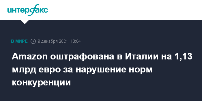 Москва. 9 декабря. INTERFAX.RU - Антимонопольный регулятор Италии (Autorita Garante della Concorrenza e del Mercato, AGCM) оштрафовал американского интернет-ритейлера Amazon.com Inc. на 1,13 млрд евро. Об этом сообщается на сайте регулятора.