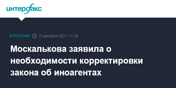 Москва. 10 декабря. INTERFAX.RU - Уполномоченный по правам человека в РФ Татьяна Москалькова заявила, что закон об иноагентах требует корректировки и уточнения; омбудсмен готова принять участие в обсуждении данного закона.